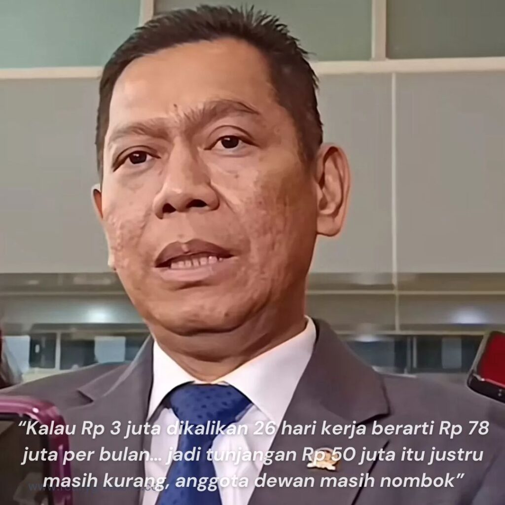 Wakil Ketua DPR dari Golkar yang membela tunjangan rumah Rp50 juta per bulan sebagai hal yang wajar karena mahalnya kontrak di sekitar Senayan. Beralasan: “Kalau Rp 3 juta dikalikan 26 hari kerja berarti Rp 78 juta per bulan… jadi tunjangan Rp 50 juta itu justru masih kurang, anggota dewan masih nombok.”