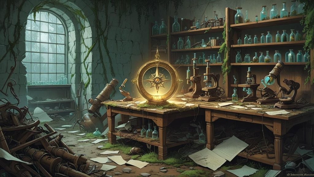 Opa menunjukkan halaman-halaman yang penuh dengan sketsa tumbuhan dan hewan detail yang sangat indah, ditulis dengan huruf kuno yang elegan. Di antara semua gambar dan tulisan itu, Opa berhenti pada satu halaman yang tampak berbeda. Ada sketsa samar sebuah benda, terlihat seperti kompas dengan jarum yang terbuat dari cahaya.