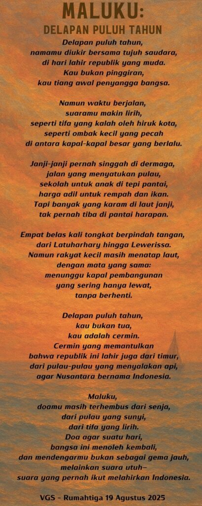 Kini, refleksi 80 tahun ini mestinya menggugah pertanyaan paling jujur: sampai kapan Maluku akan tetap berada di pinggiran riuh pembangunan nasional? Apakah kita rela melihat Maluku terus menjadi “provinsi pendiri” yang ironisnya justru ditinggalkan oleh republik yang turut ia lahirkan?