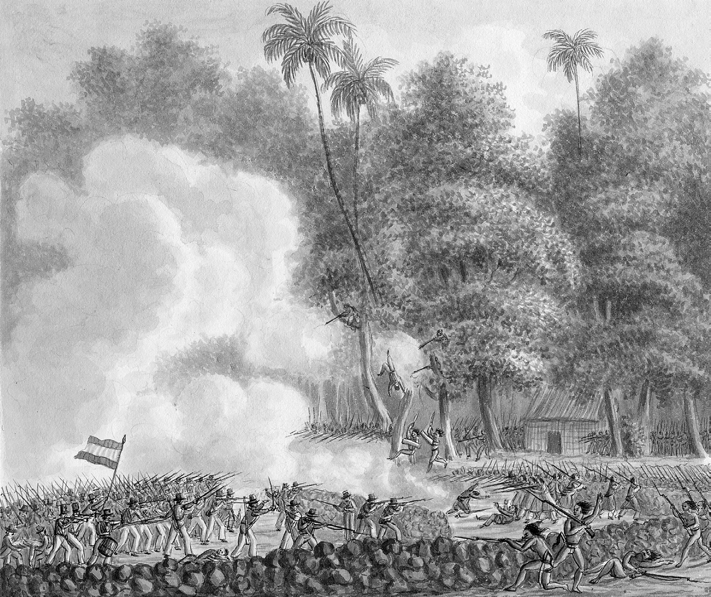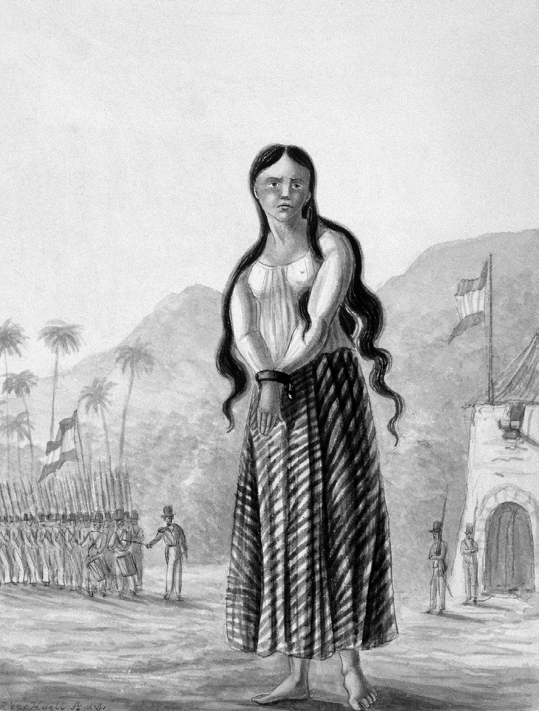 “Zij stond daar, in eene edele ongedwongene houding, de donkere oogen met zielvolle, en vorschende blikken op ieder van ons slaande, nu en dan de handen wringende door het ang- stig gevoel, dat haar hart overstelpte. Op eens stort zij wanhopig den Heer buyskes te voet, en smeekt in roerende woorden om ontferming voor haren grijzen vader; doch helaas! er was geene hoop meer: de stichter van haar aanwezen, dien zij tot in het midden van het krijgsrumoer gevolgd was, – moest sneven! Zij rigtte zich weder op, en verliet ons met strak- ke, neêrgeslagen blikken. Zij werd echter, uit aanmerking van hare jeugd, ontslagen; doch verkoos bij haren, in de ijzers geklonken, vader te blijven.” [Vader en Dochter, 2018]