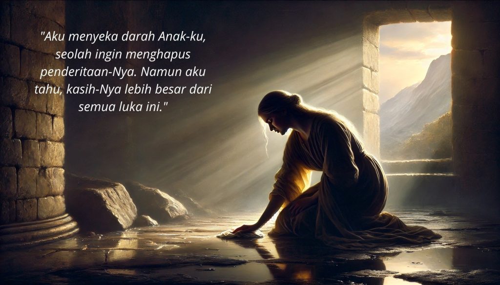 Seketika, air mata Maria membanjir. Ia ingin berlari, ingin memeluk anaknya, ingin meraih-Nya, membawa-Nya pulang, membiarkan-Nya beristirahat dalam dekapannya seperti dulu. Tetapi ia hanya bisa berdiri di sana, menyaksikan semuanya, menanggung pedih yang tak terkatakan.