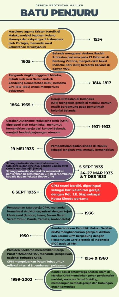 Perjalanan GPM dapat dipahami sebagai sebuah ringkasan sejarah gereja di Indonesia, yang mencerminkan pasang surutnya dari abad ke abad. Sejarah ini dimulai jauh sebelum tahun 1935 dan mencakup berbagai periode di bawah pengaruh kolonial yang berbeda. Untuk memberikan gambaran yang jelas, timeline berikut menyajikan tonggak sejarah utama yang membentuk GPM menjadi sebuah gereja yang mandiri dan berkarakteristik unik.
