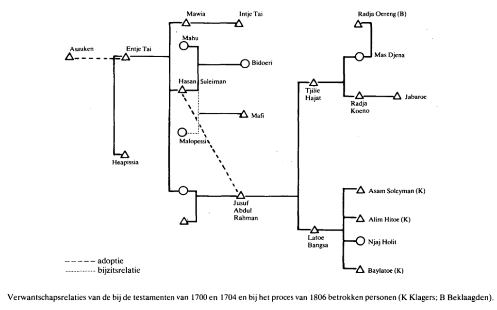 Berikut adalah diagram kekerabatan dari orang-orang yang terlibat dalam surat wasiat tahun 1700 dan 1704 serta proses tahun 1806.