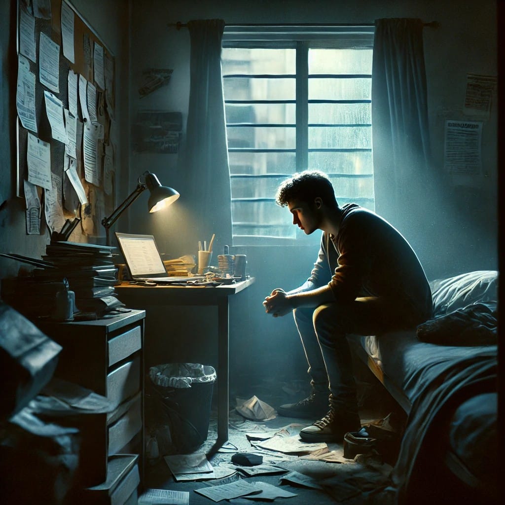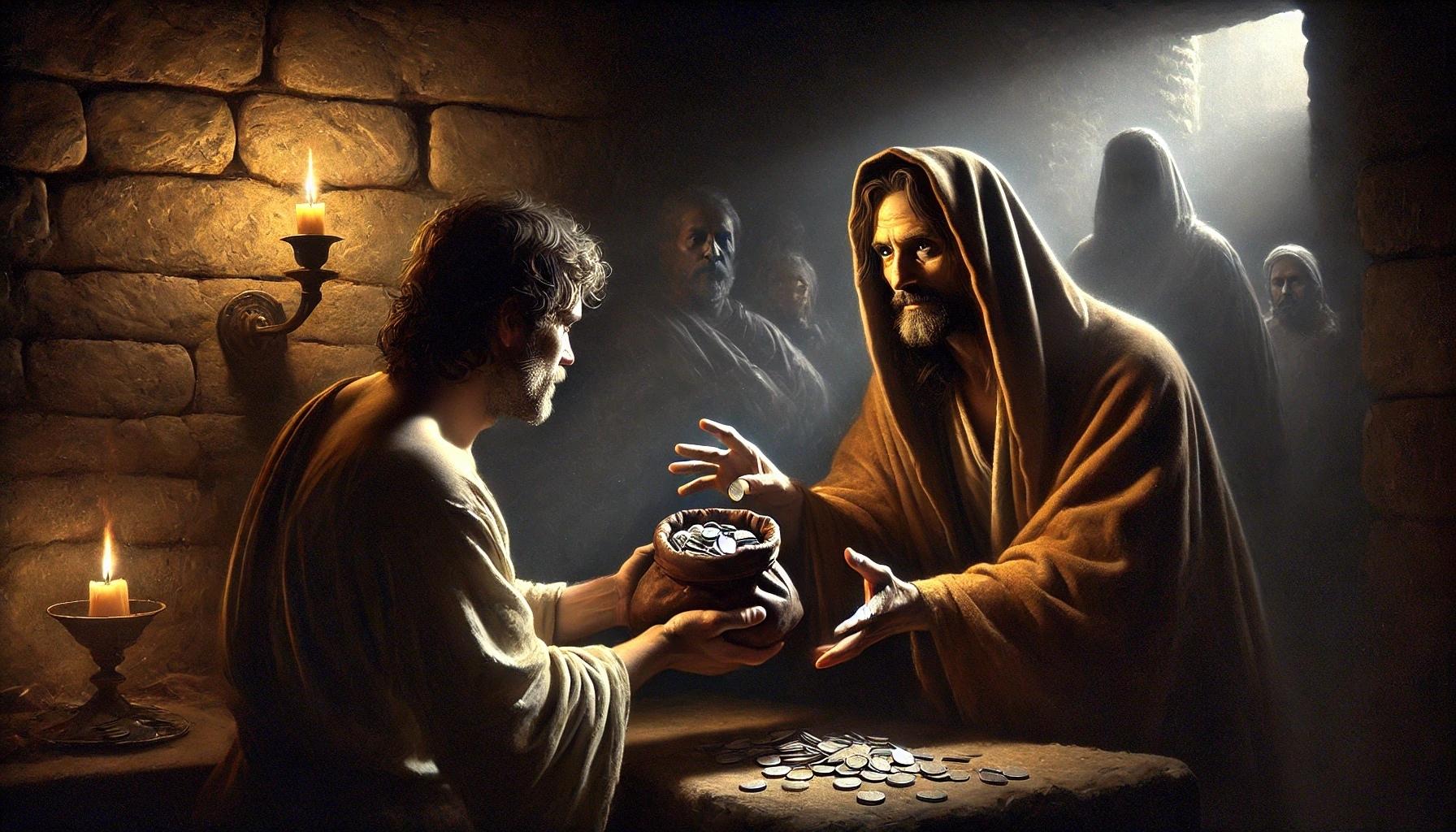 Yudas duduk menyendiri, menjauh dari perapian tempat para murid berkumpul, terlarut dalam pikirannya yang penuh keraguan dan gelisah. Matanya menatap kegelapan malam, seolah-olah dia sedang mencari sesuatu yang tidak pasti, sesuatu yang mungkin telah hilang dari pandangannya. Dalam keheningan itu, pikirannya berkecamuk dengan pertanyaan yang sulit dijawab.